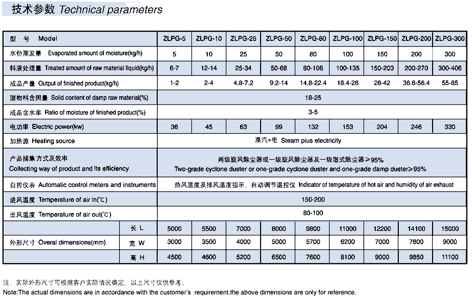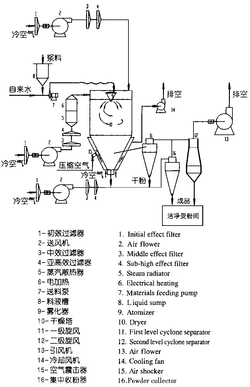 Chinese herbal medicine extract is refined from root, stem and leaves of plants, and contains high sugar especially from alcoholization process, which is easy melted at high temperature. Normal centrifugal spraying cannot meet its drying requirements. For that reason, our company organized a group of technicians to develop such a dryer especially used for Chinese herbal medicine extract atter repeated calculations and countless tests on the basis of our experiences to make spraying dryer and collect advantages of same kind of dryers from both domeStic and abroad. Modifications have been made when designing Chinese Herbal Medicine EXtract Spraying Dryer : 1 .The diameter and height of the tower have be modified to ensure that powder cannot reach at the wall of the tower before drying, and ensure that powder will have dwelling time in hot air to complete low-temperature drying. The wall of the tower has sandwich cooling device to ensure liquid materials not to be softened, melt or coked when they are stuck on the wall which will have partial high-temperature. There is air shocker on the cone body which has larger taper and can pulsate the tube by compressed air to shake down powder which is stuck on the tube. 2.All contact place inside the dryer have plain or round surtace, and is ground and polished(fine polish over 10) to avoid sand hole and dead angIe etc. The contact surface is made of stainIess steeI to ensure materials free of pollution. The driving parts have good sealing to prevent water and oil. Materials discharge is done by sealed butterfly valve to avoid air leaking. Discharge pipes are connected flexibly for easy dismantling in order to meet GMP requirement. 3.There-stage air filters are used on air pre-treatment system and air can be purified up to 100 thousand level. 4.PLC program control system circuit is used and cartoons of contact screen dispIays technological process. Variable data carries out automatic trace and regulation by fuzzy technique, the atomizer is adjusted stably by frequency converter, temperature of incoming air is adjusted by the power-reguIator, precision can teach pIus and minus two so as to largely reduce energy consumption. lncoming and outgoing temperature as well as pressure inside the tower can be set up precisely